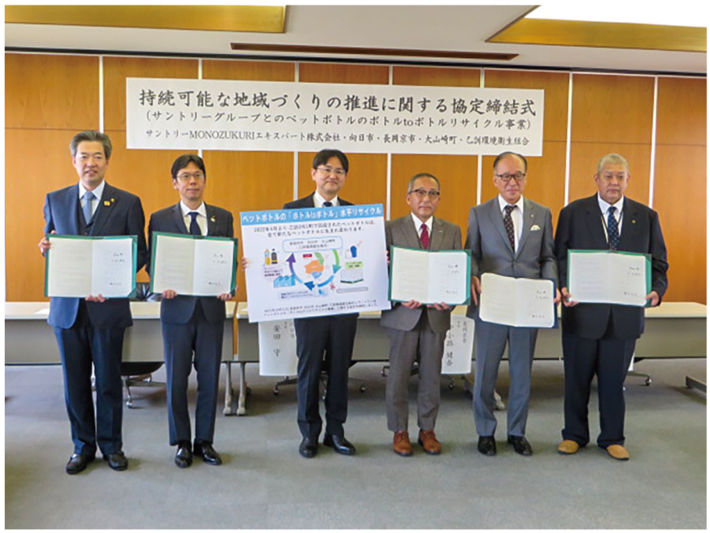 さらに、令和4年4月から住民・行政・ 事業者が一体となり「循環型社会」の実現を目指すため、サントリーグループ、乙訓二市一町と乙訓環境衛生組合との間において「持続可能な地域づくりの推進に関する協定」を締結し、使用済みペットボトルを新たなペットボトルに再 生することで化石由来資源の削減とCO2の削減に寄与することができる「ボトルtoボトルリサイクル事業」の取組 みがスタートしました。