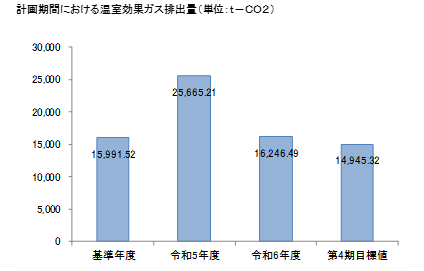 「第4期乙訓環境衛生組合地球温暖化防止実行計画」は、クリーンプラザおとくにから排出される温室効果ガスを削減するため、9年間(令和4年度から12年度まで)を計画期間として、排出量削減目標や取組み内容を定めた計画です。本実行計画は、平成25年度(15,991.52t-CO2)を基準年度とし、令和12年度に約7%、令和2年度の実績値(21,104.62t-CO2)からは約30%削減することを目標に掲げています。